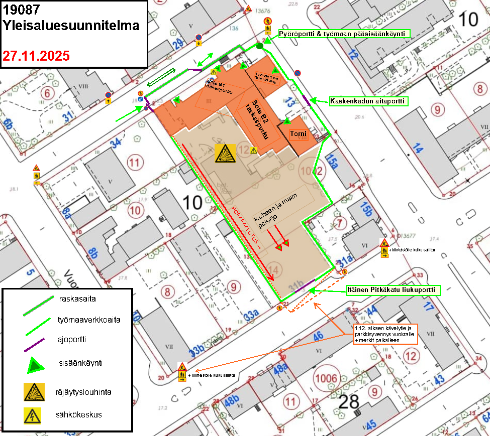 Kaskia hyvinvointikorttelin työmaalla jatkuvat lähiviikkoina mm. porapaalutustyöt, kaivutyöt ja maa-ainesten poisvienti. Purkutöitä tehdään Tornitalossa sekä vanhassa sairaalarakennuksessa (tulevassa Kaskenmäen sotekeskuksessa). Työt jatkuvat normaalisti ennen joulua ja välipäivinä, mutta työmaa on suljettuna joulupyhinä ja uudenvuodenpäivänä.